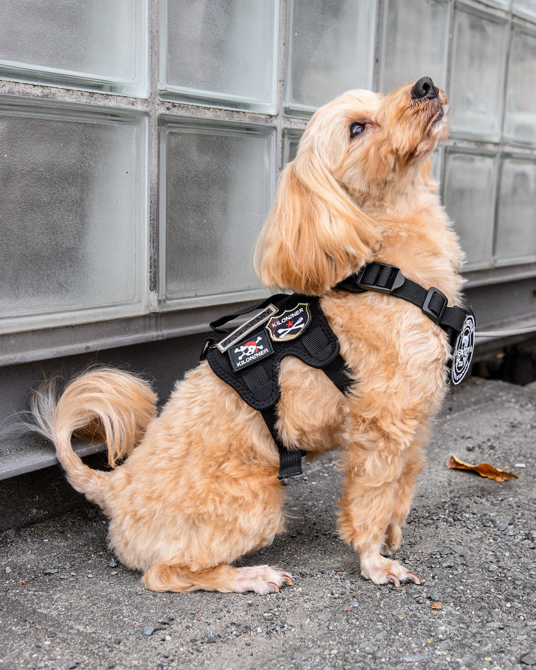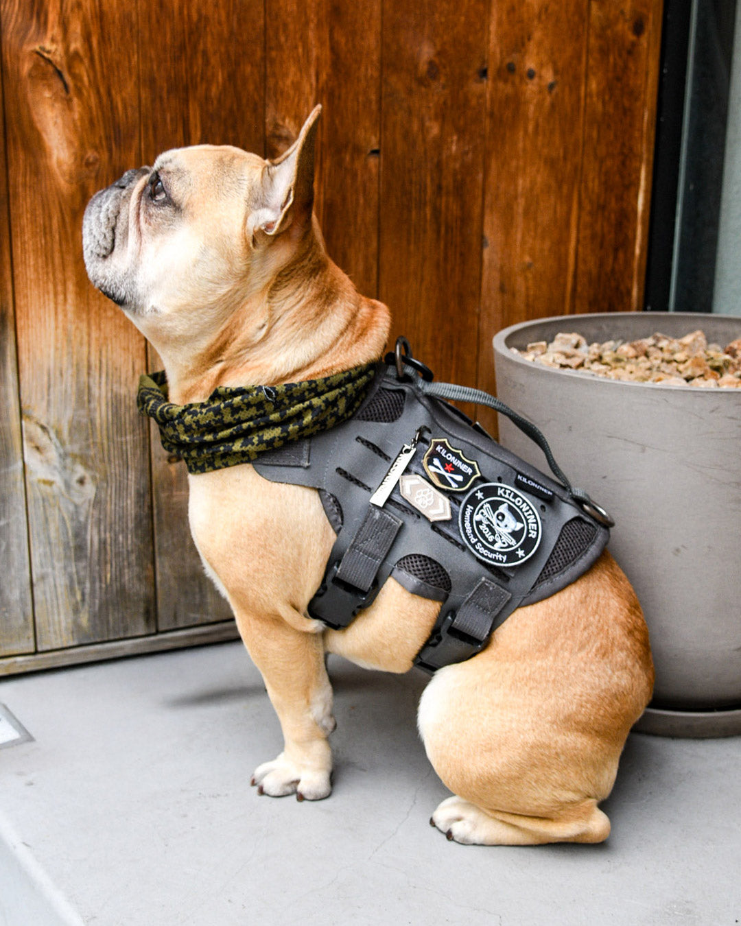 裏面は面ファスナーなので、アイロンや穴あけの必要も無く、簡単にハーネスやリードに貼り付けてカスタマイズが楽しめます。