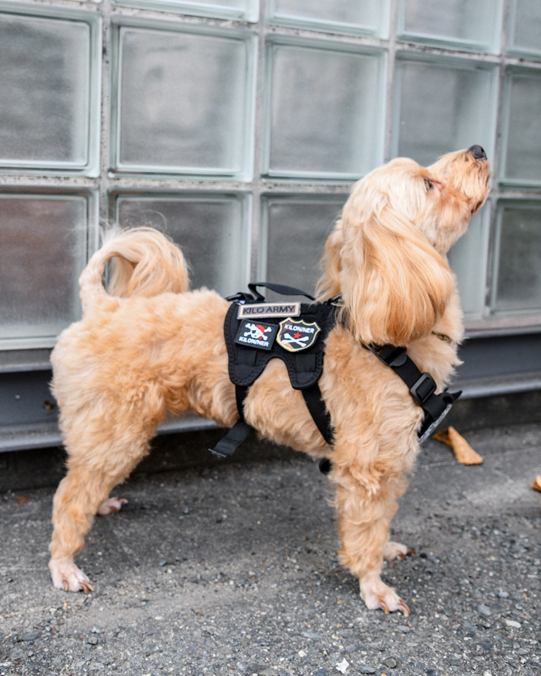 裏面は面ファスナーなので、アイロンや穴あけの必要も無く、簡単にハーネスやリードに貼り付けてカスタマイズが楽しめます。
