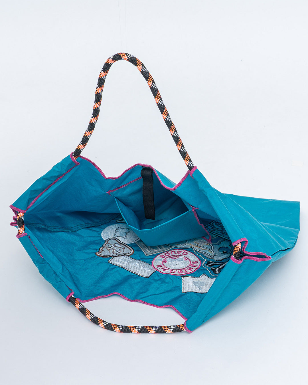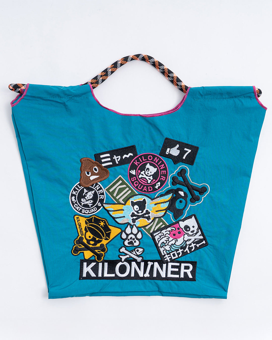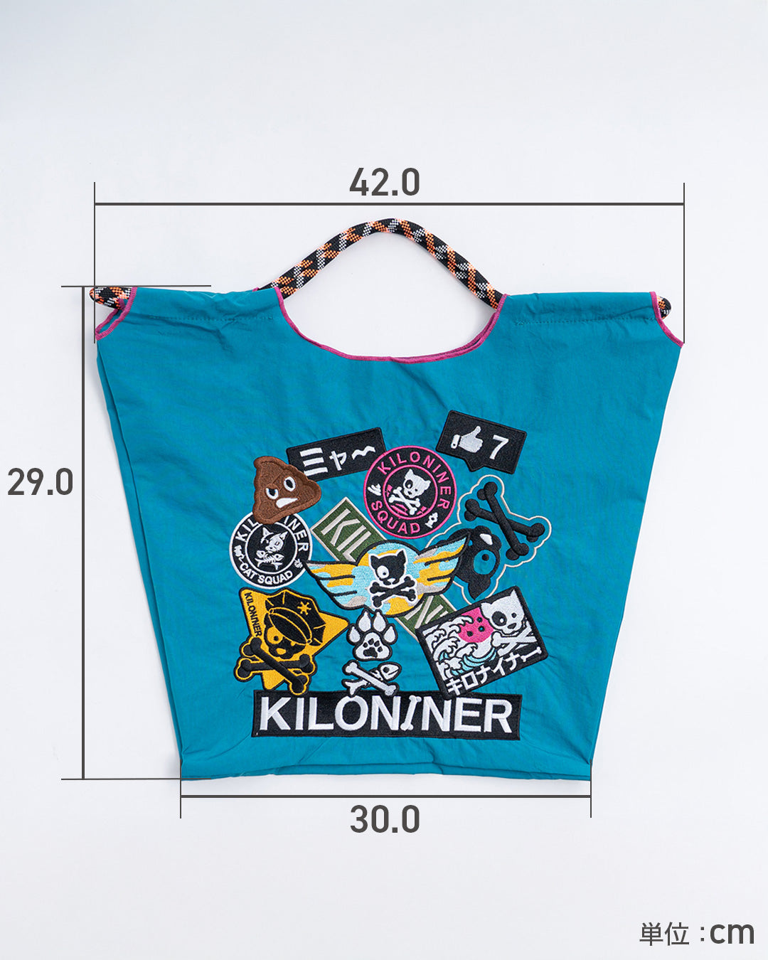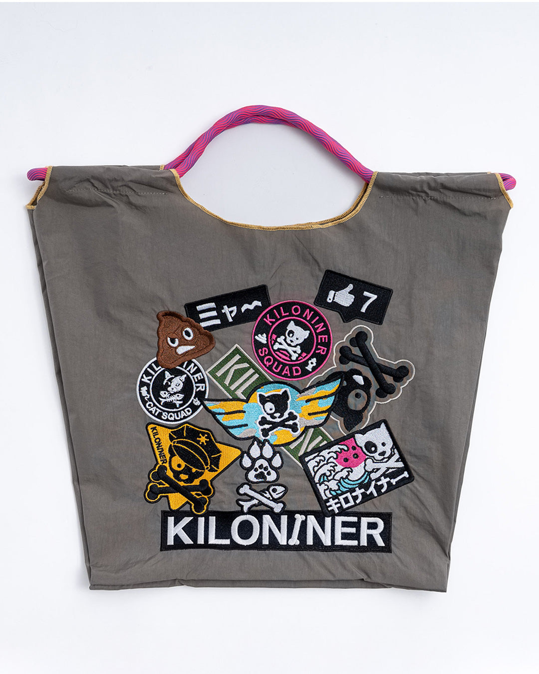 ワッペンをたっぷりあしらった、遊び心のあるデザインのトートバッグです。