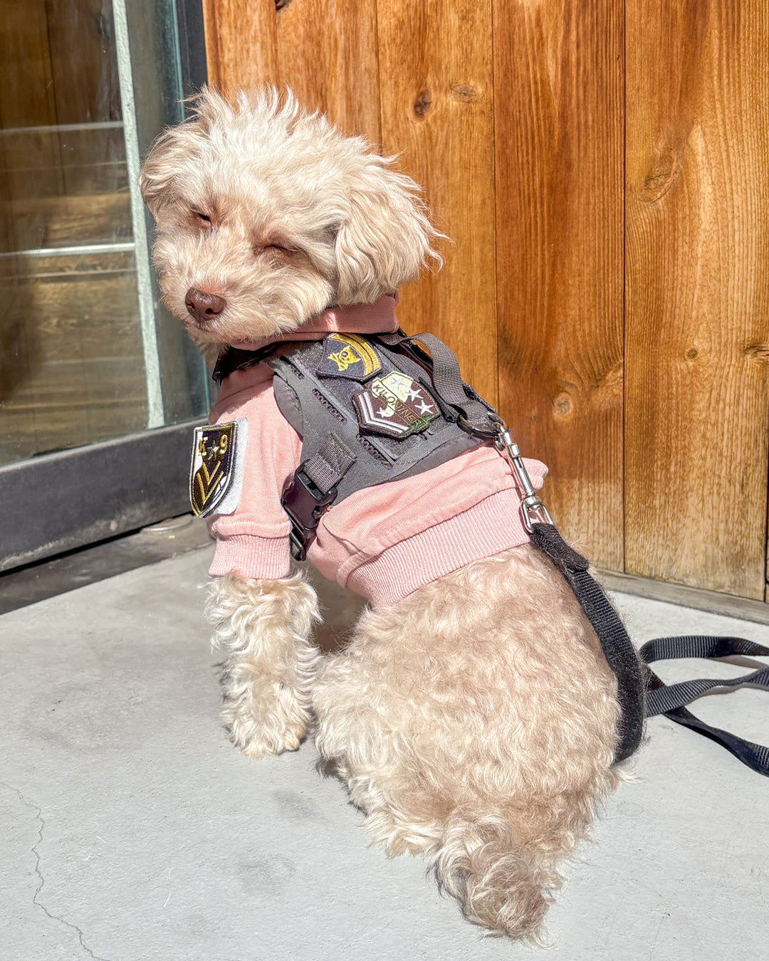 裏面は面ファスナーなので、アイロンや穴あけの必要も無く、簡単にハーネスやリードに貼り付けてカスタマイズが楽しめます。