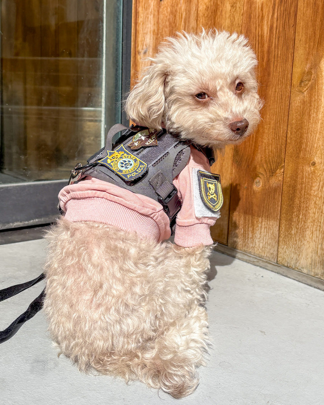 裏面は面ファスナーなので、アイロンや穴あけの必要も無く、簡単にハーネスやリードに貼り付けてカスタマイズが楽しめます。