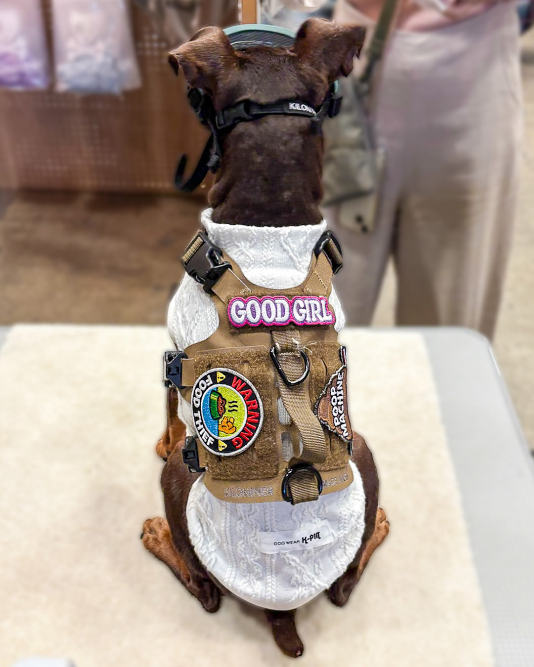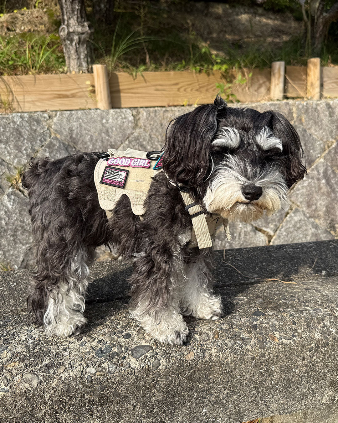 裏面は面ファスナーなので、アイロンや穴あけの必要も無く、簡単にハーネスやリードに貼り付けてカスタマイズが楽しめます。