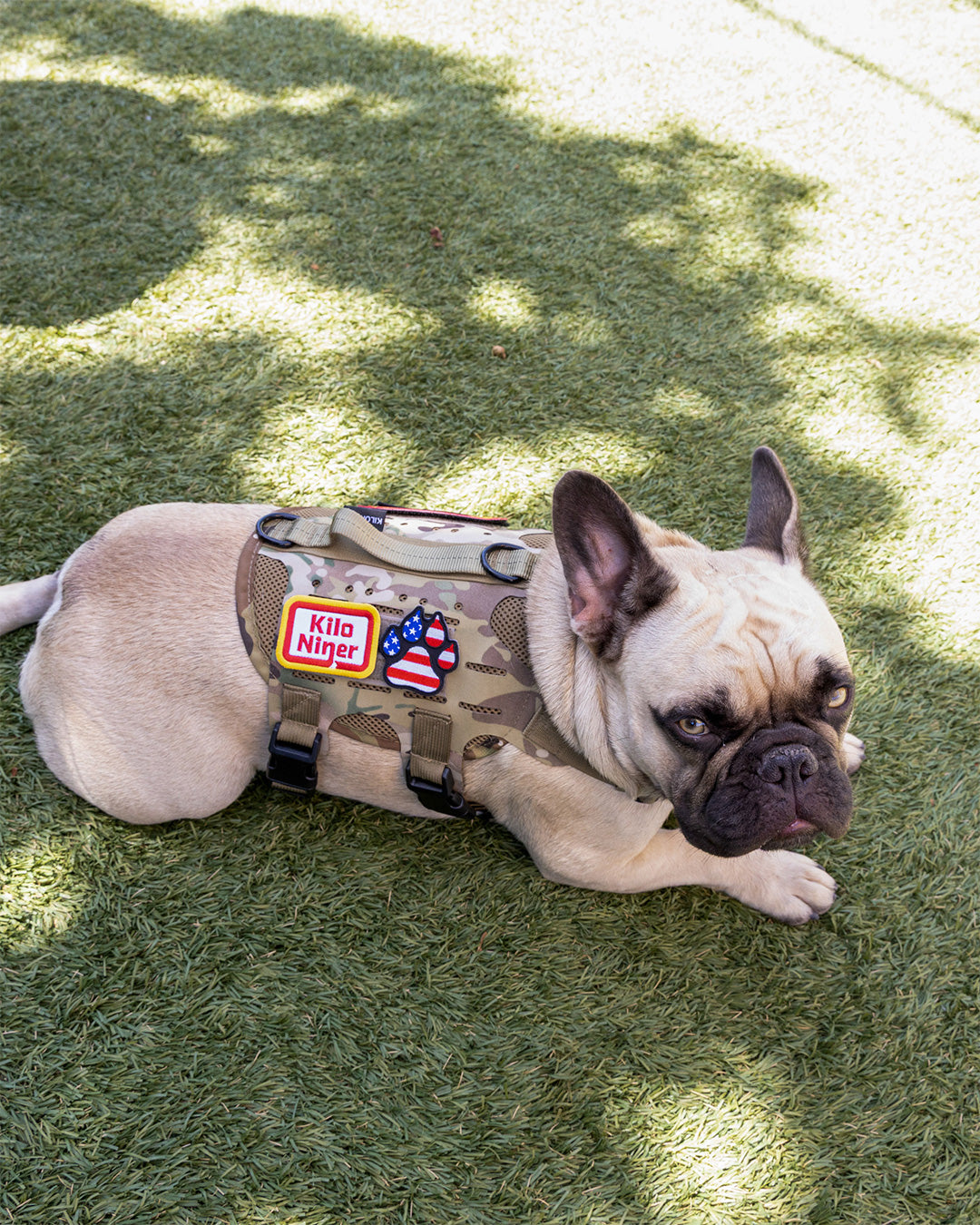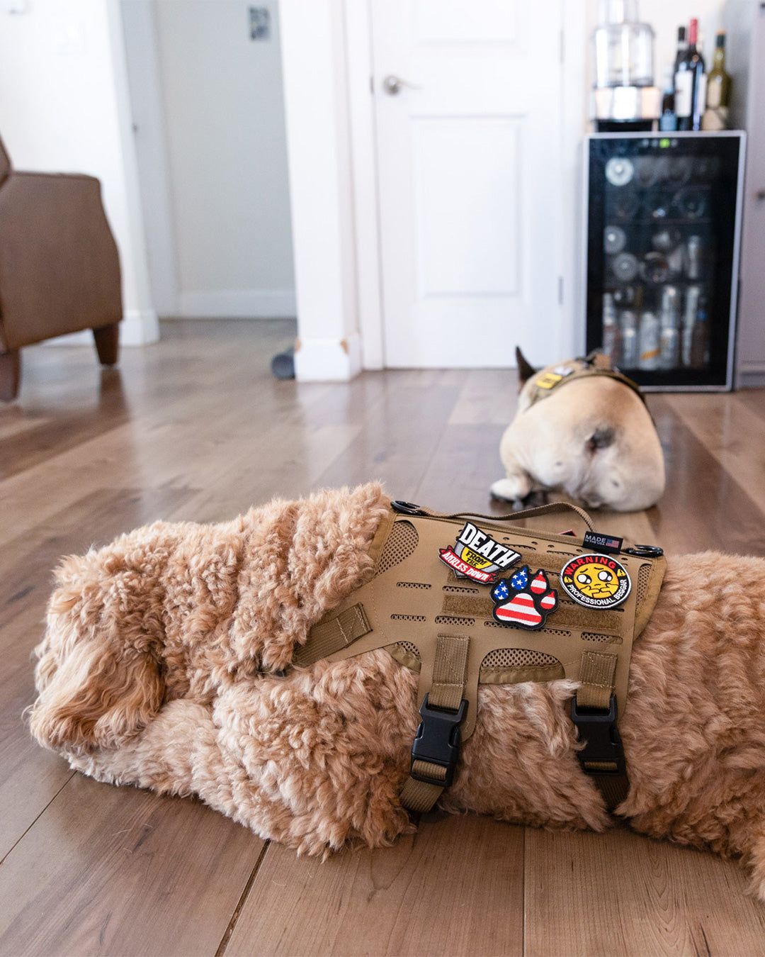 裏面はマジックテープ(ベルクロ生地)なので、アイロンや穴あけの必要も無く、簡単にハーネスやリードに貼り付けてカスタマイズが楽しめます。