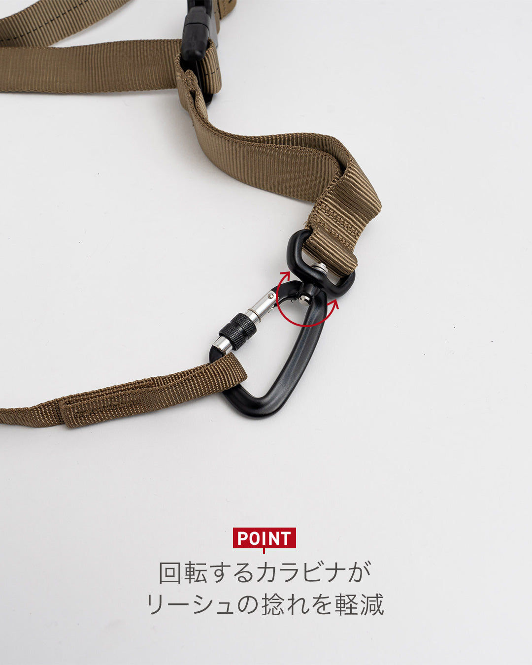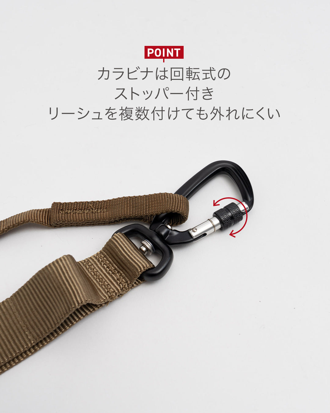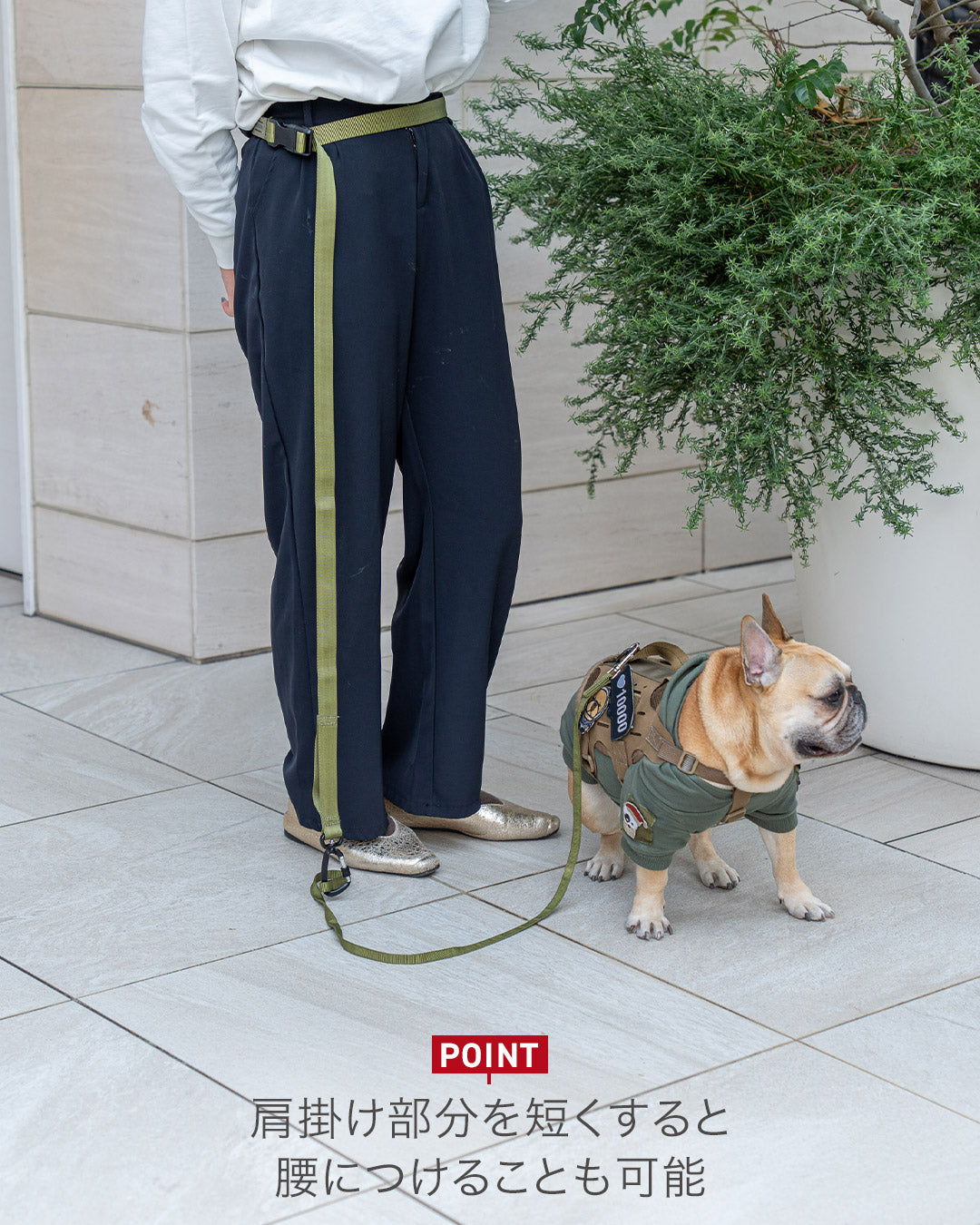 肩掛けや腰での装着が可能なリーシュです。両手が空くので、物の出し入れやスマホの操作がしやすく便利です。