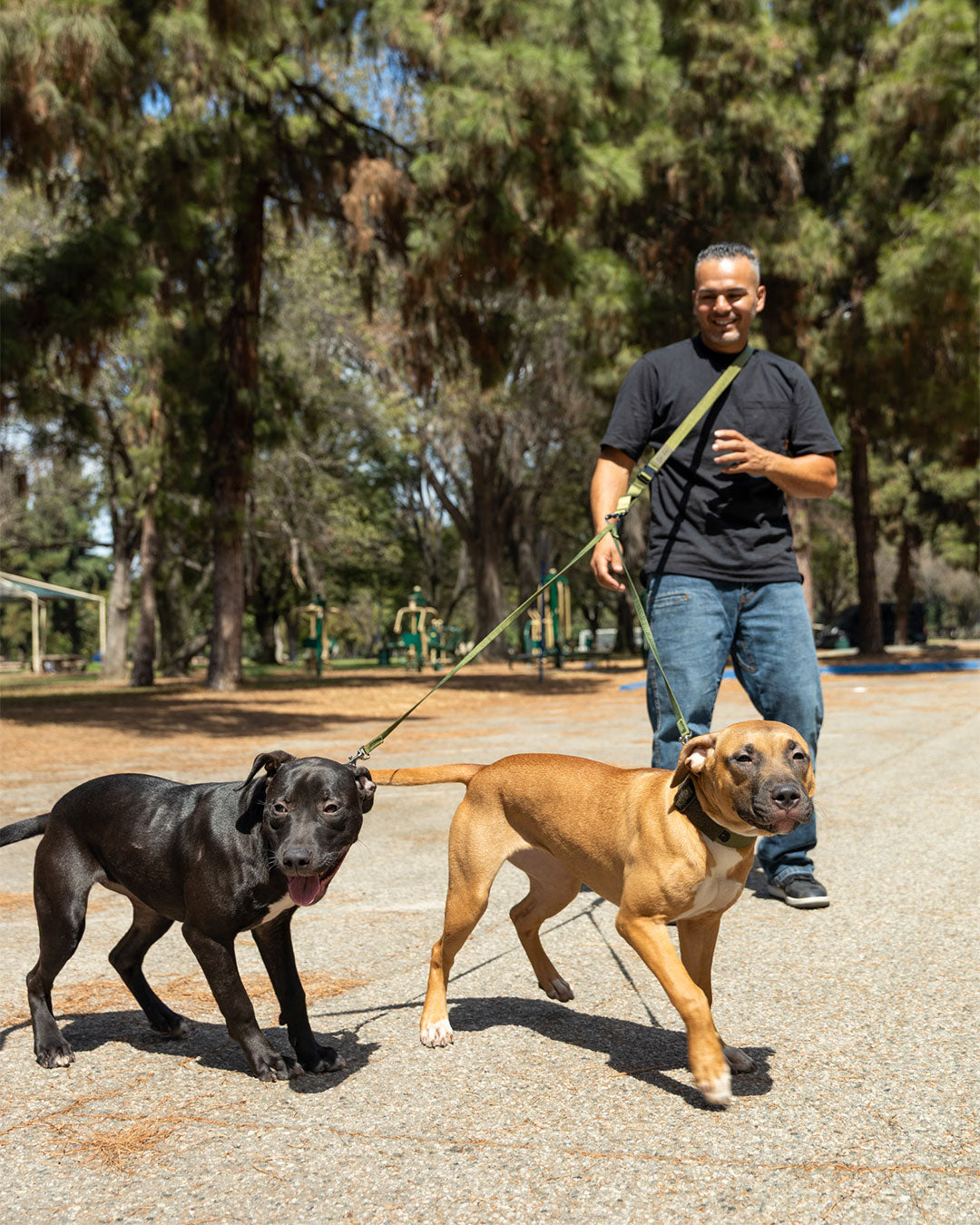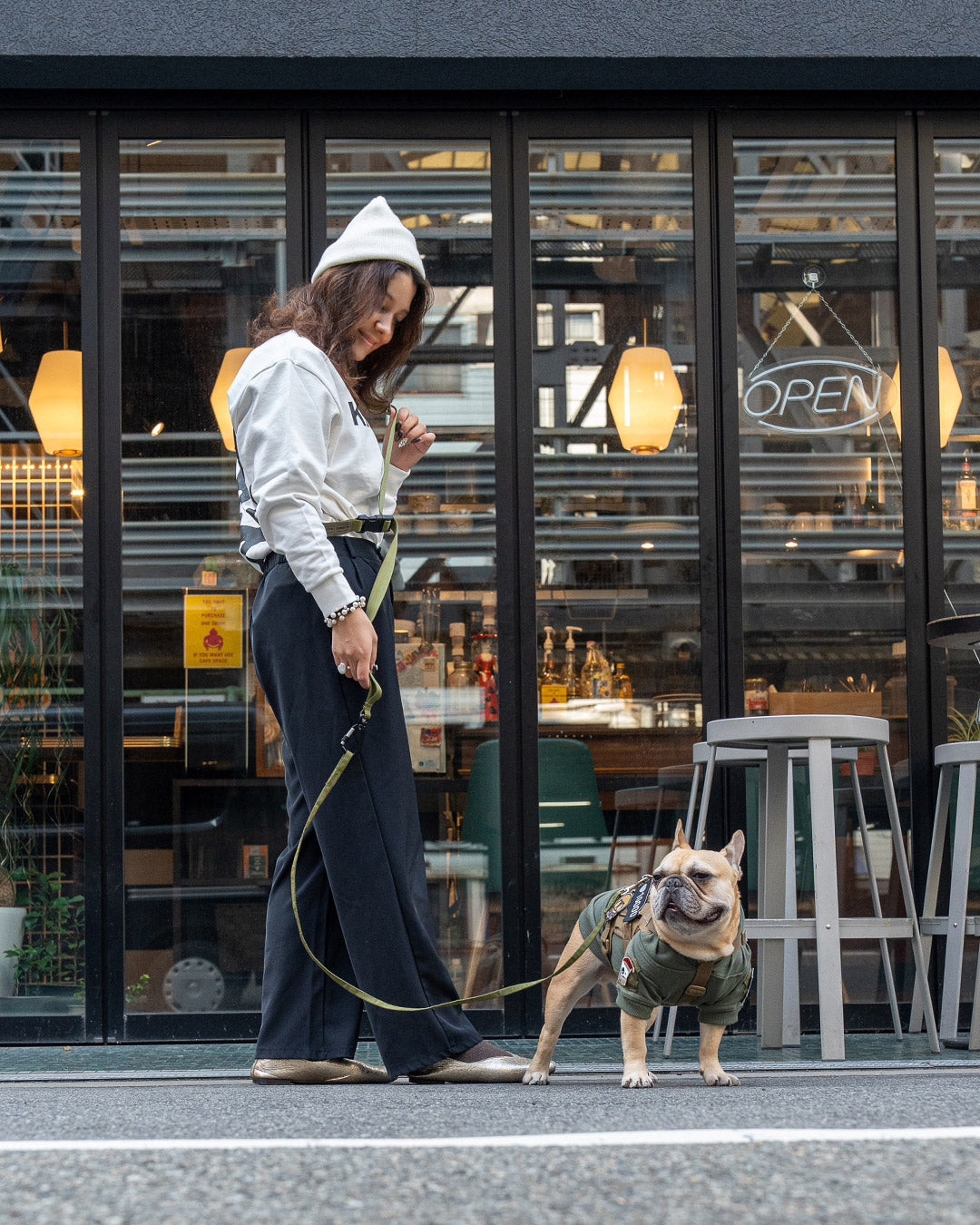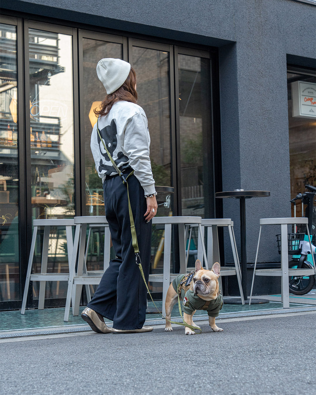 肩掛けや腰での装着が可能なリーシュです。両手が空くので、物の出し入れやスマホの操作がしやすく便利です。
